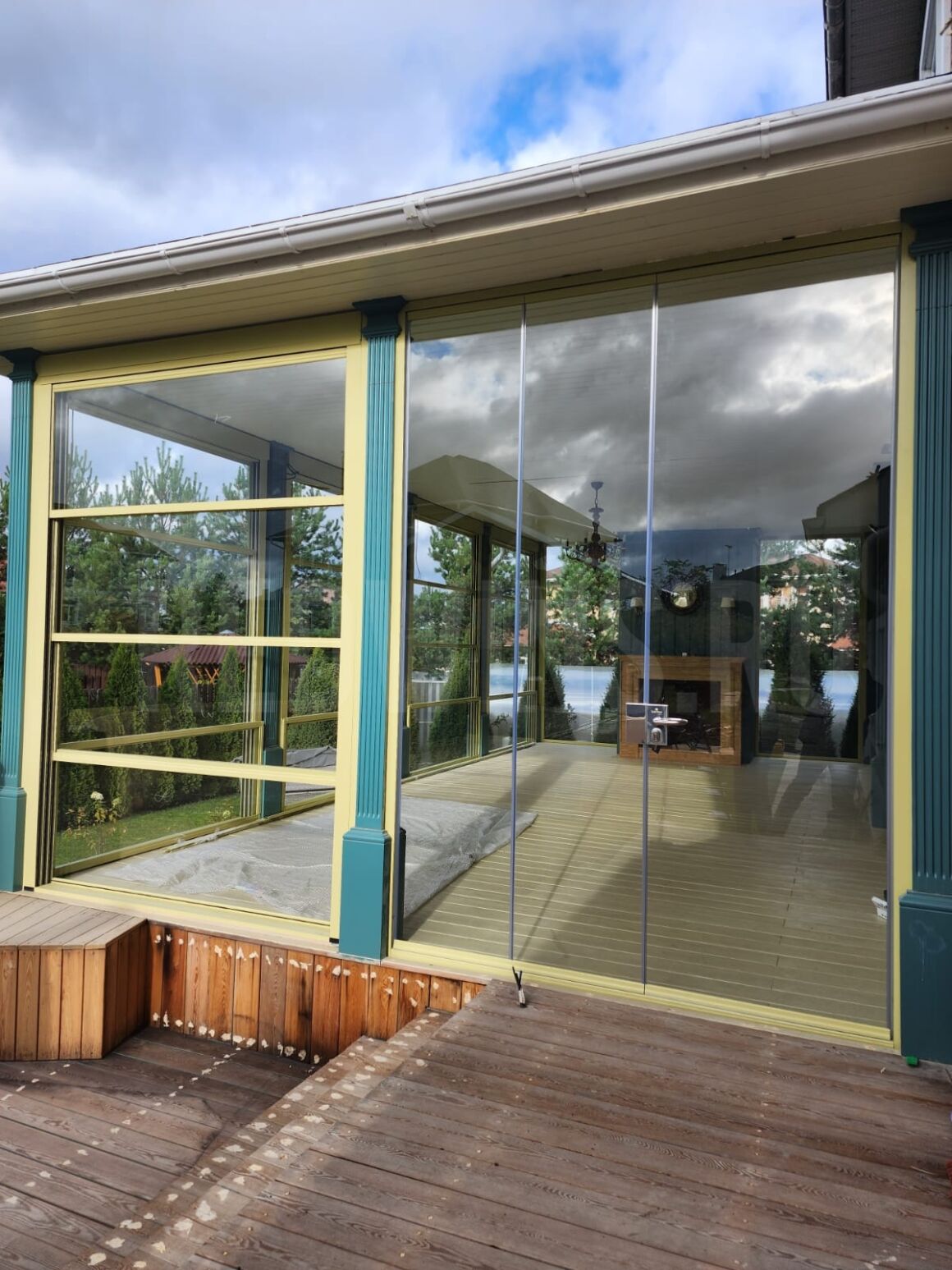 Гильотинное и безрамное остекление террасы. Система «Книжка» с дверью и замком.