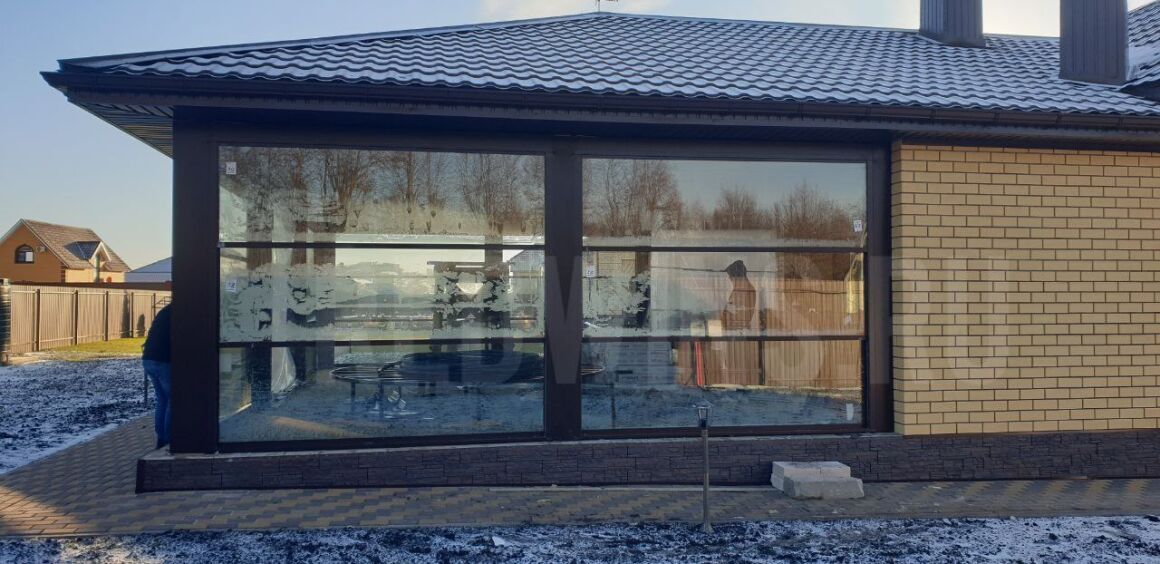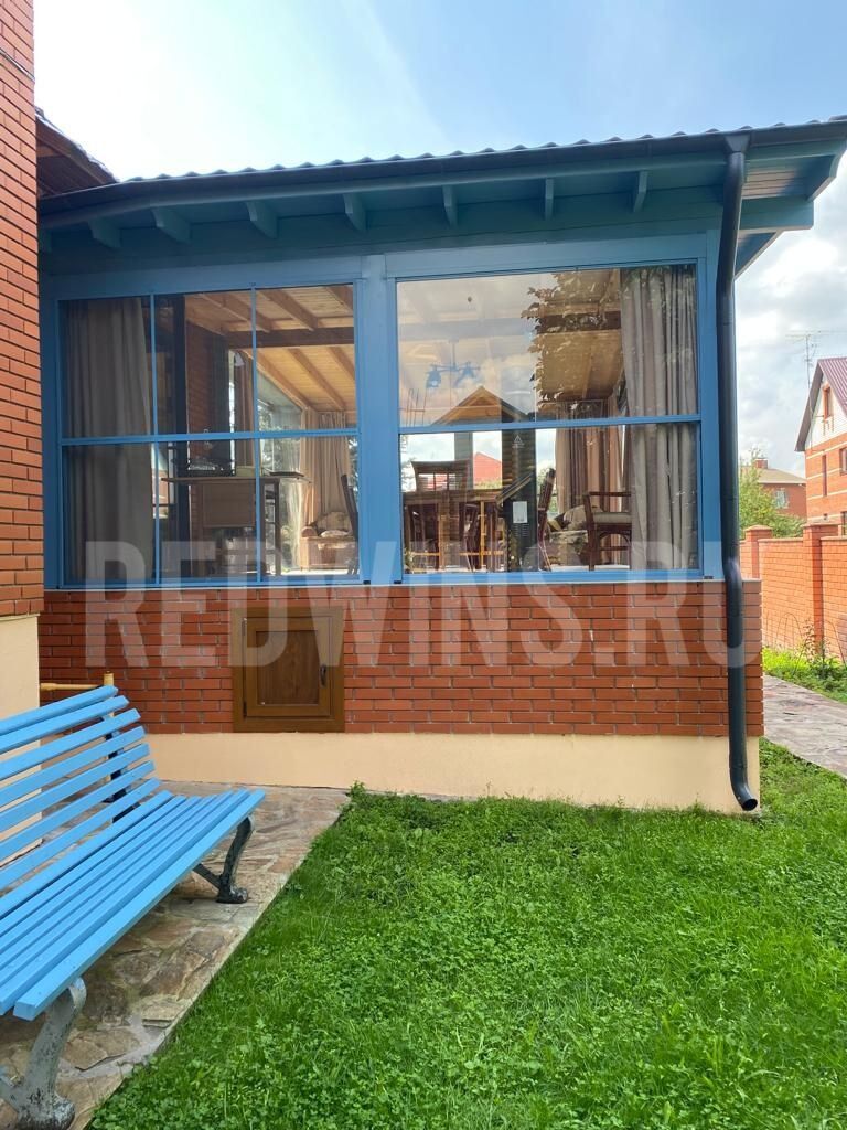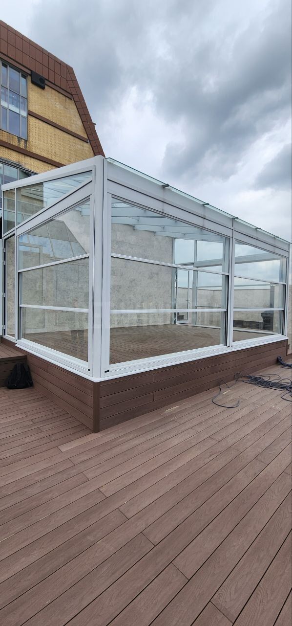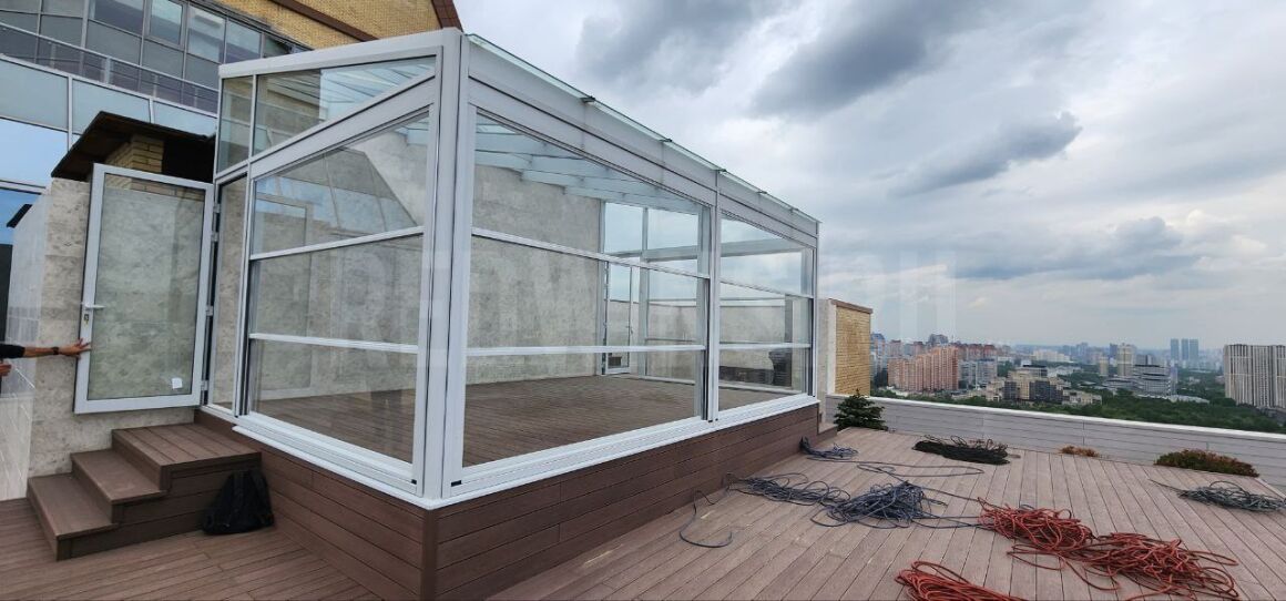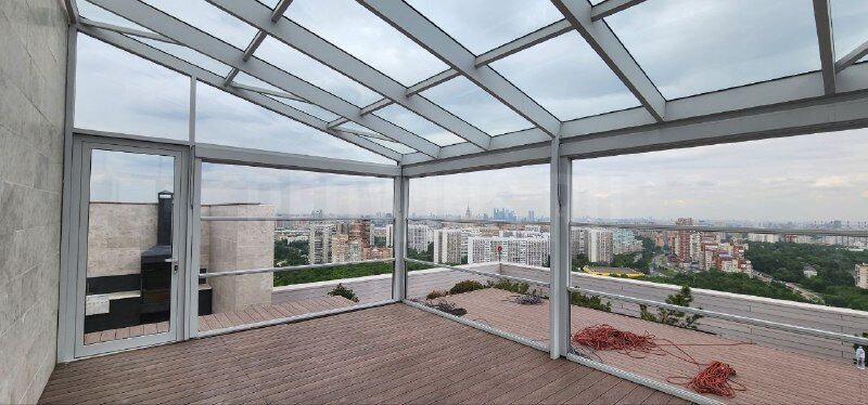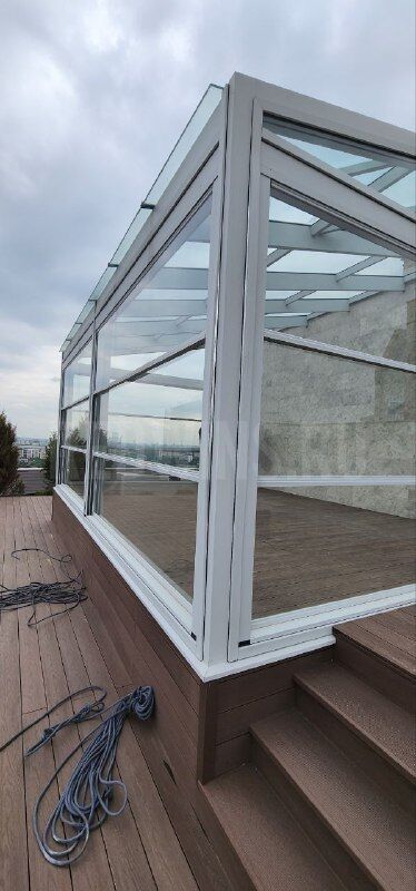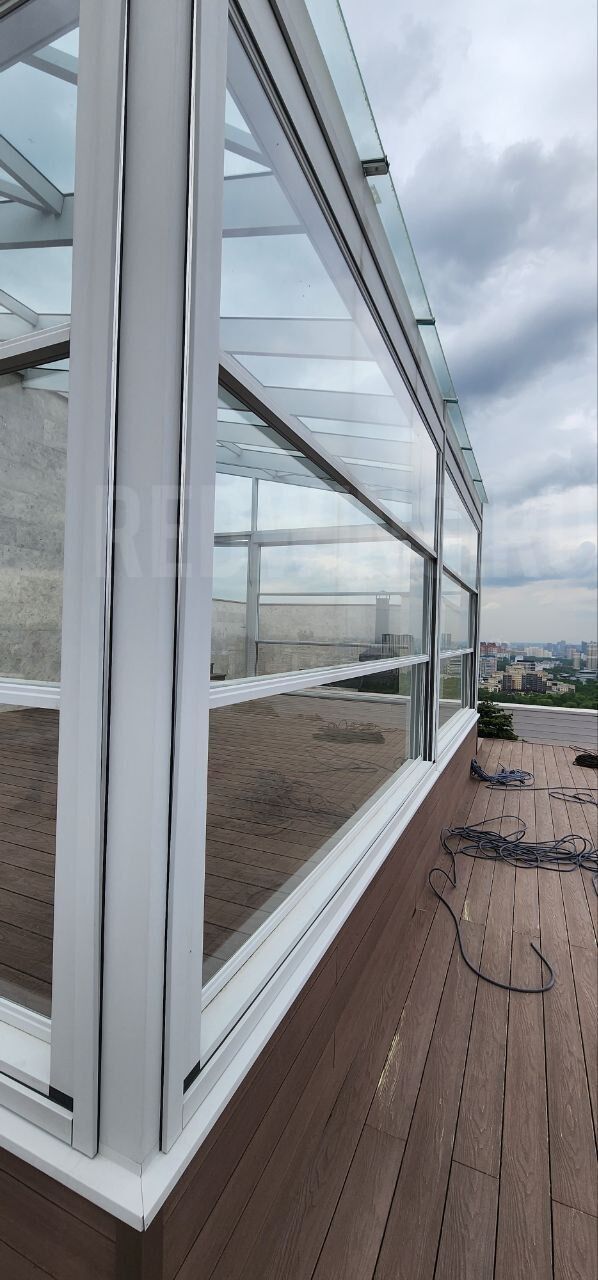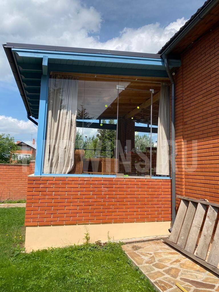 Гильотинное остекление террасы. Остекление подкрышной части нестандарных окон из алюминиевого профиля. Безрамное остекление типа «Книжка» торца.