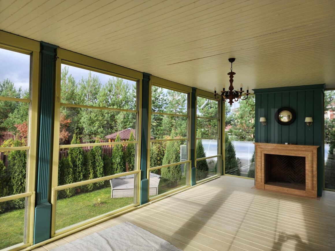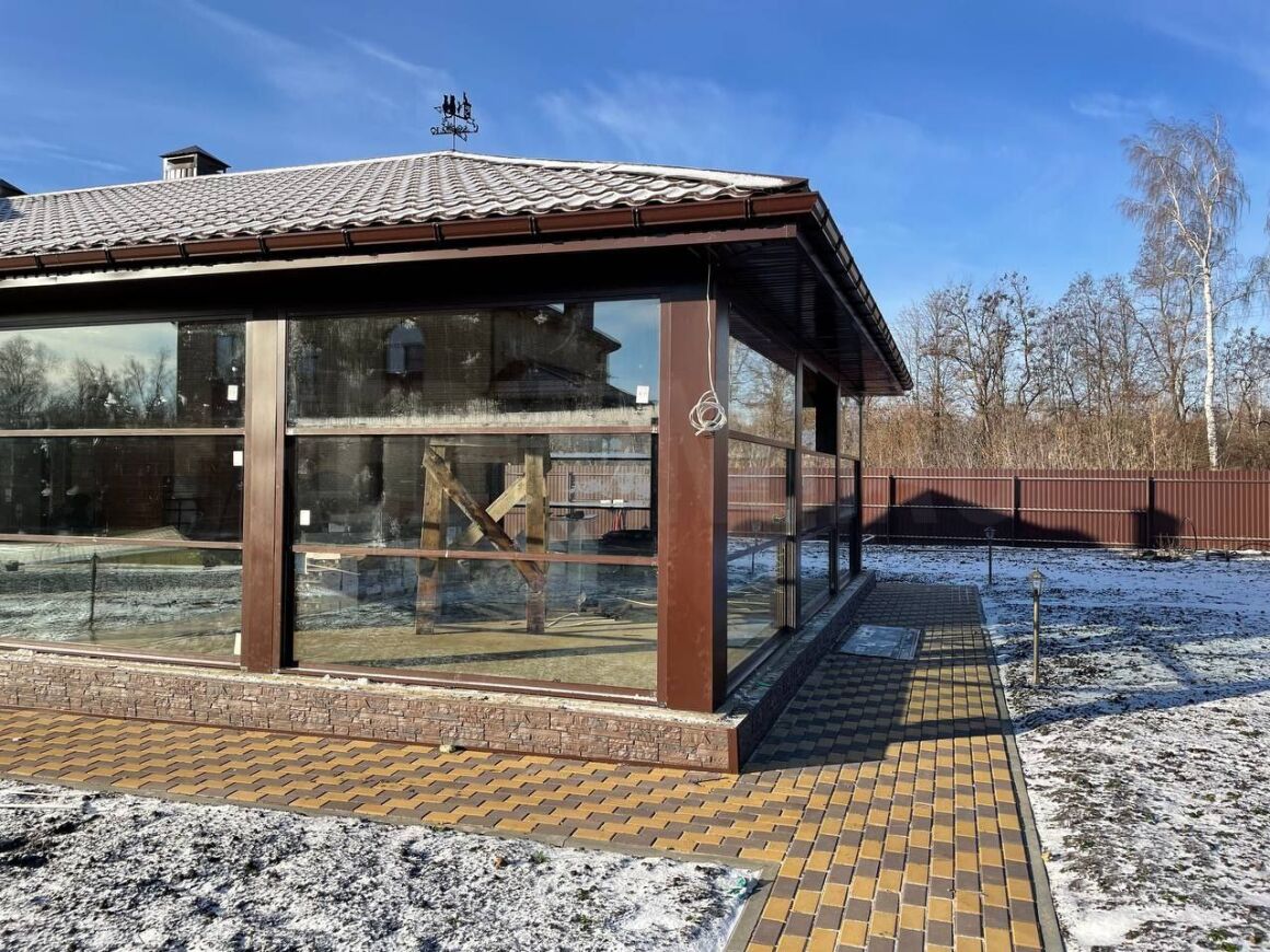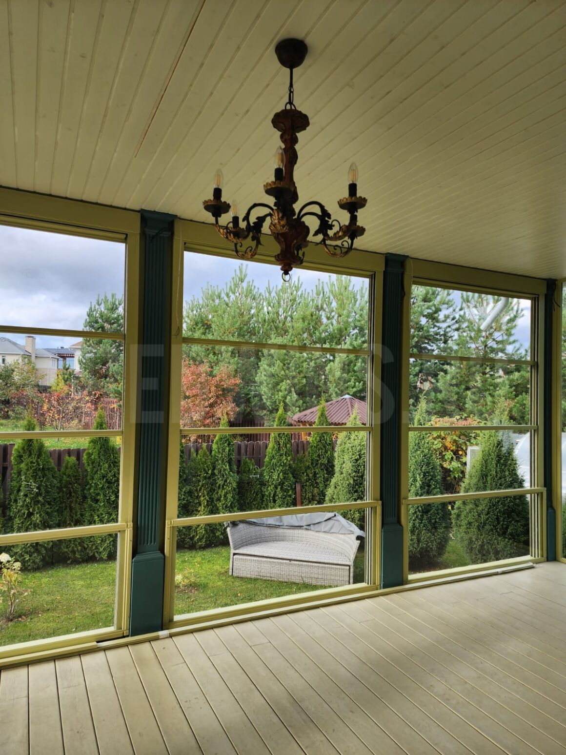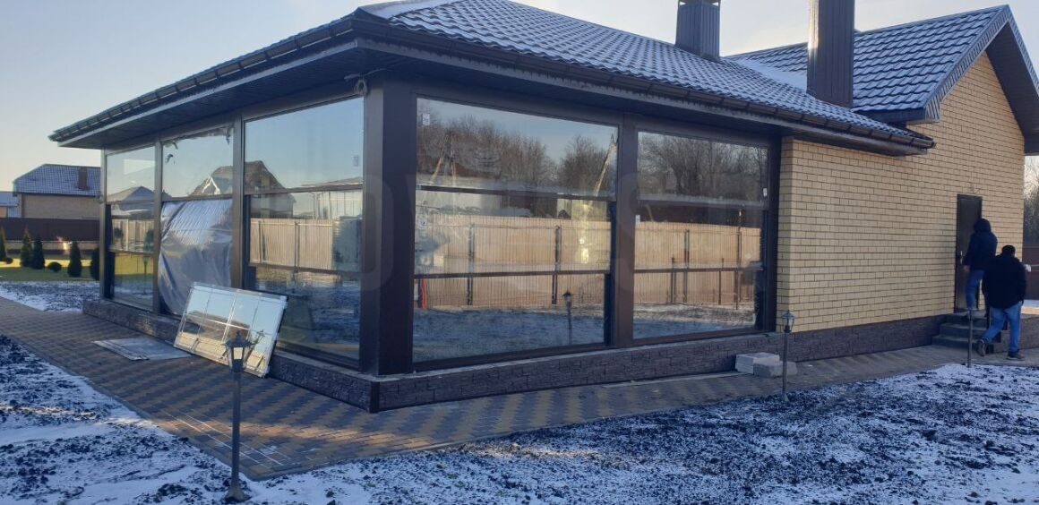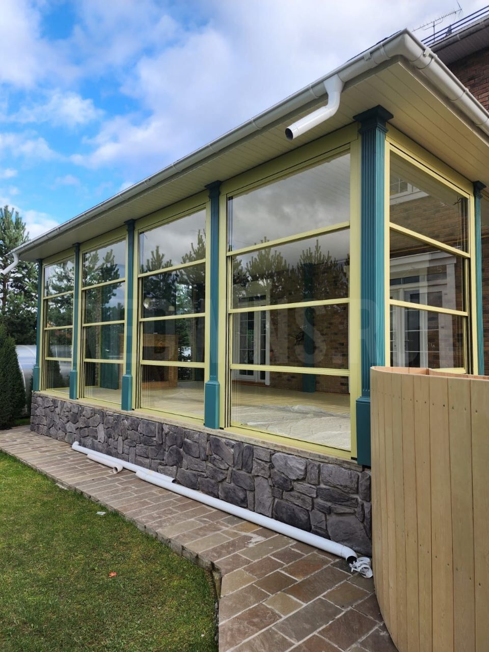 Гильотинное остекление террасы. Остекление подкрышной части нестандарных окон из алюминиевого профиля. Безрамное остекление типа «Книжка» торца.