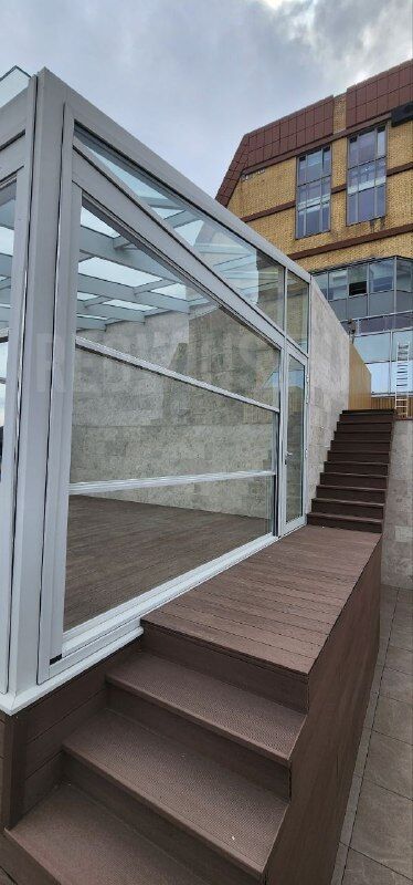 Гильотинное остекление выхода на крышу. Стеклянная кровля. Алюминевые подкрышные окна и входная дверь.