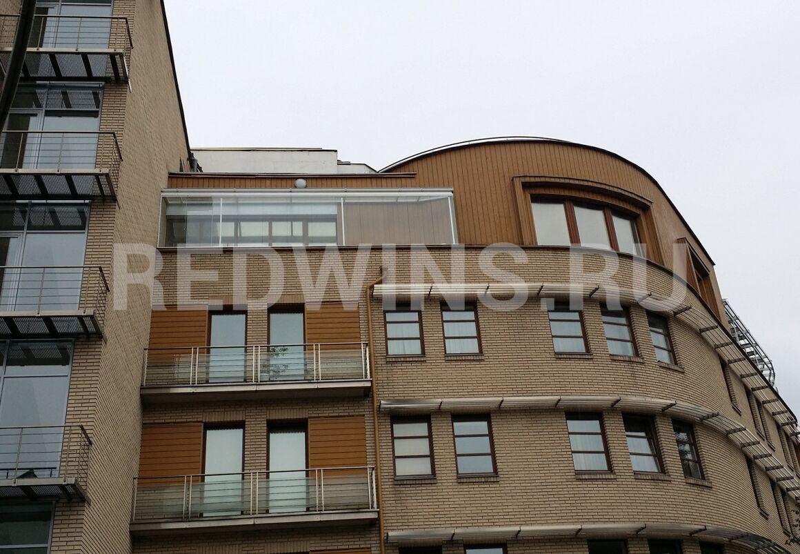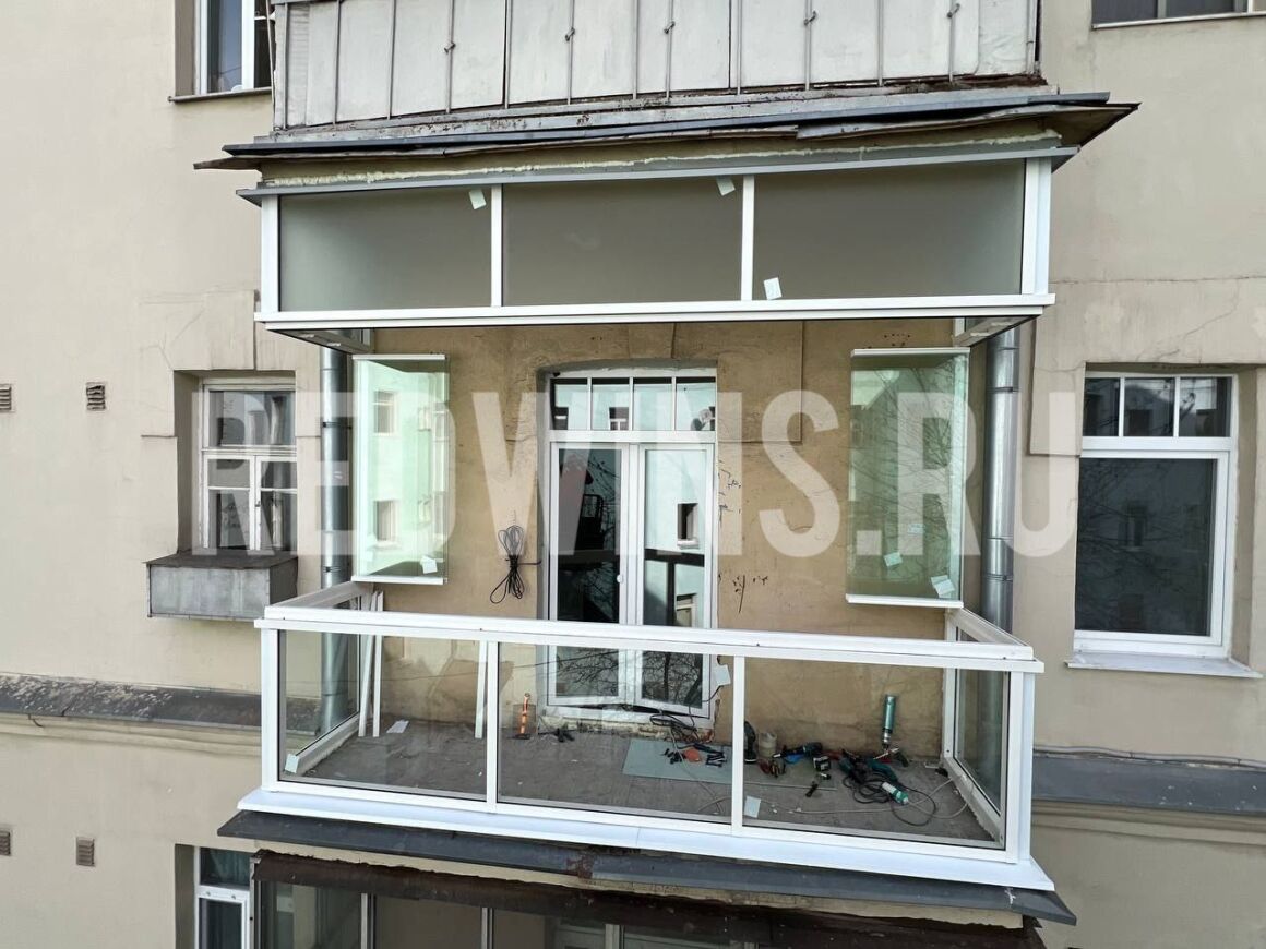 Безрамное остекление балкона системой Книжка и фасадное остекление алюминиевым профилем.