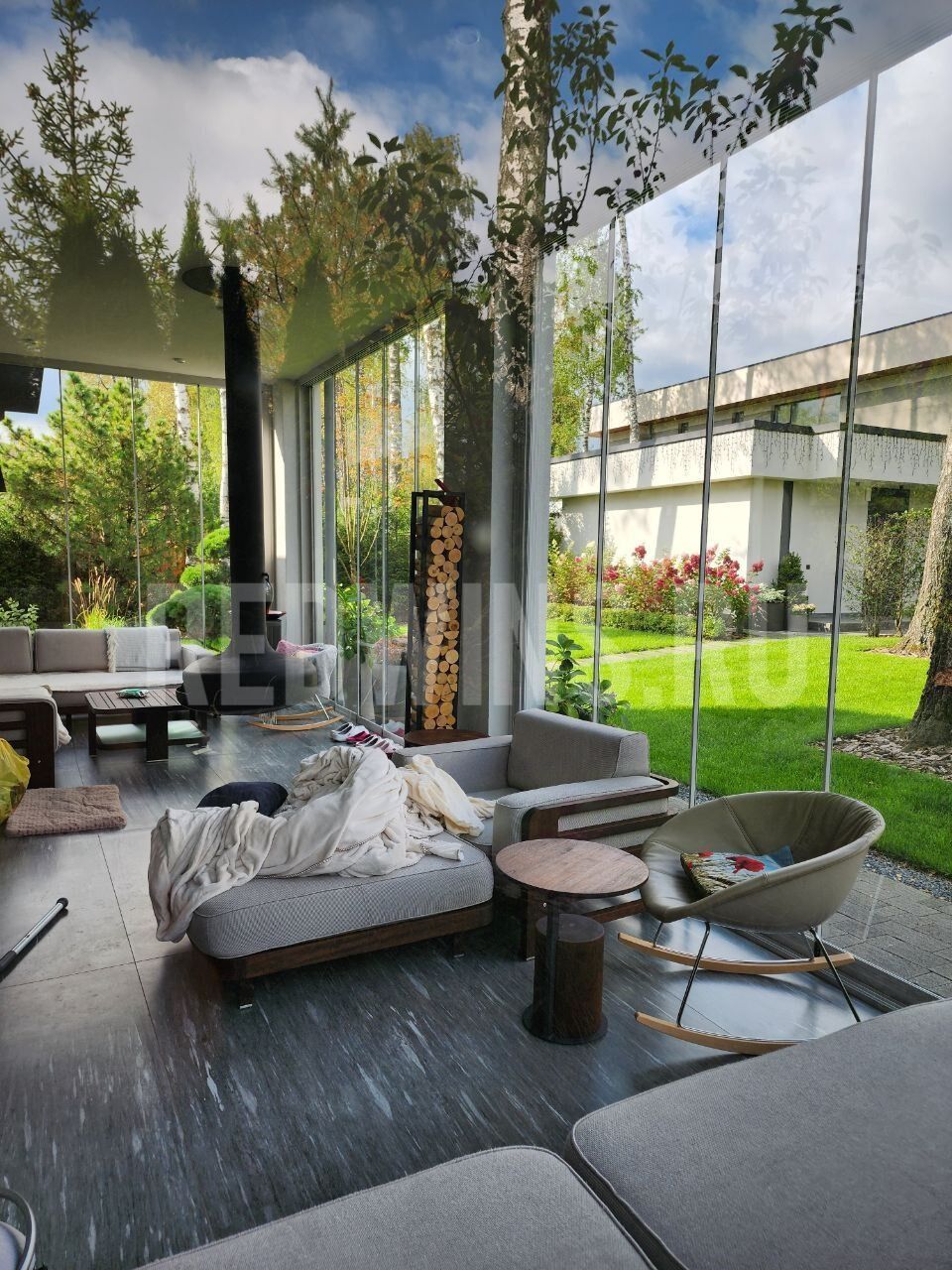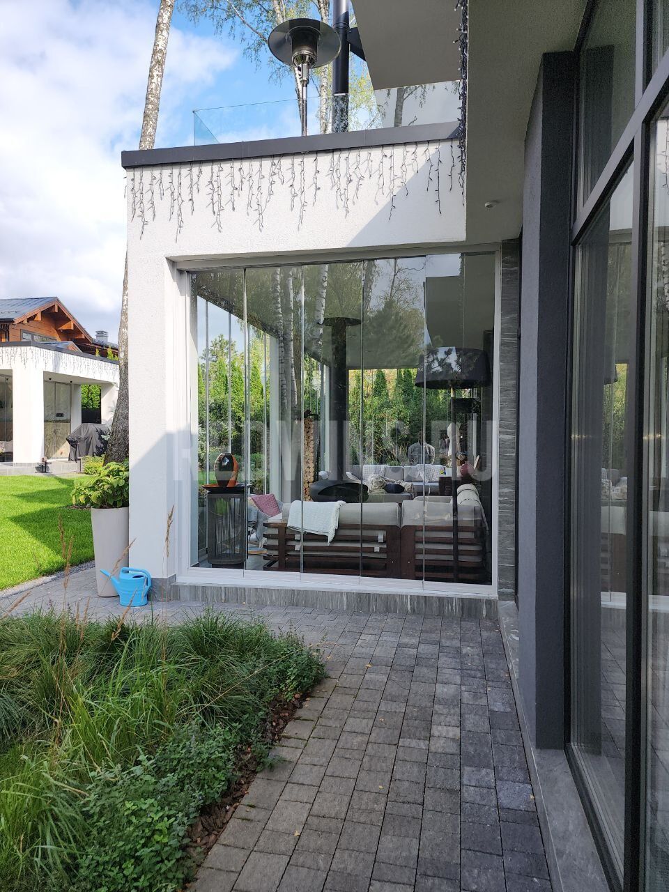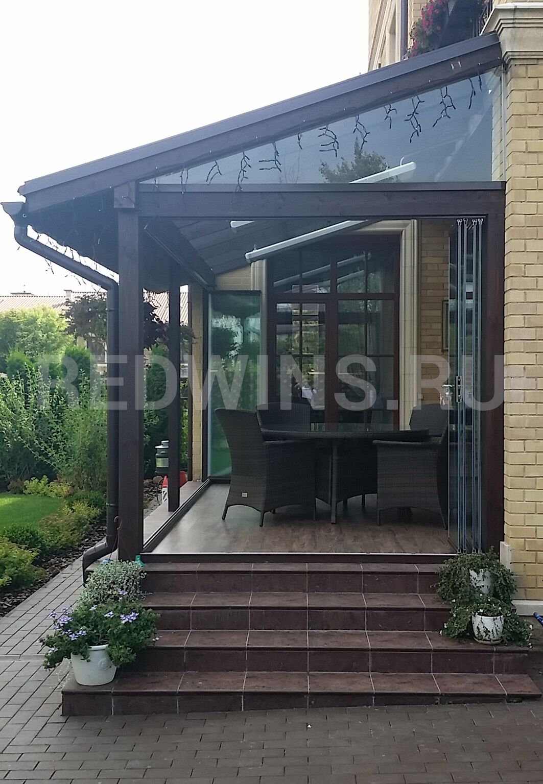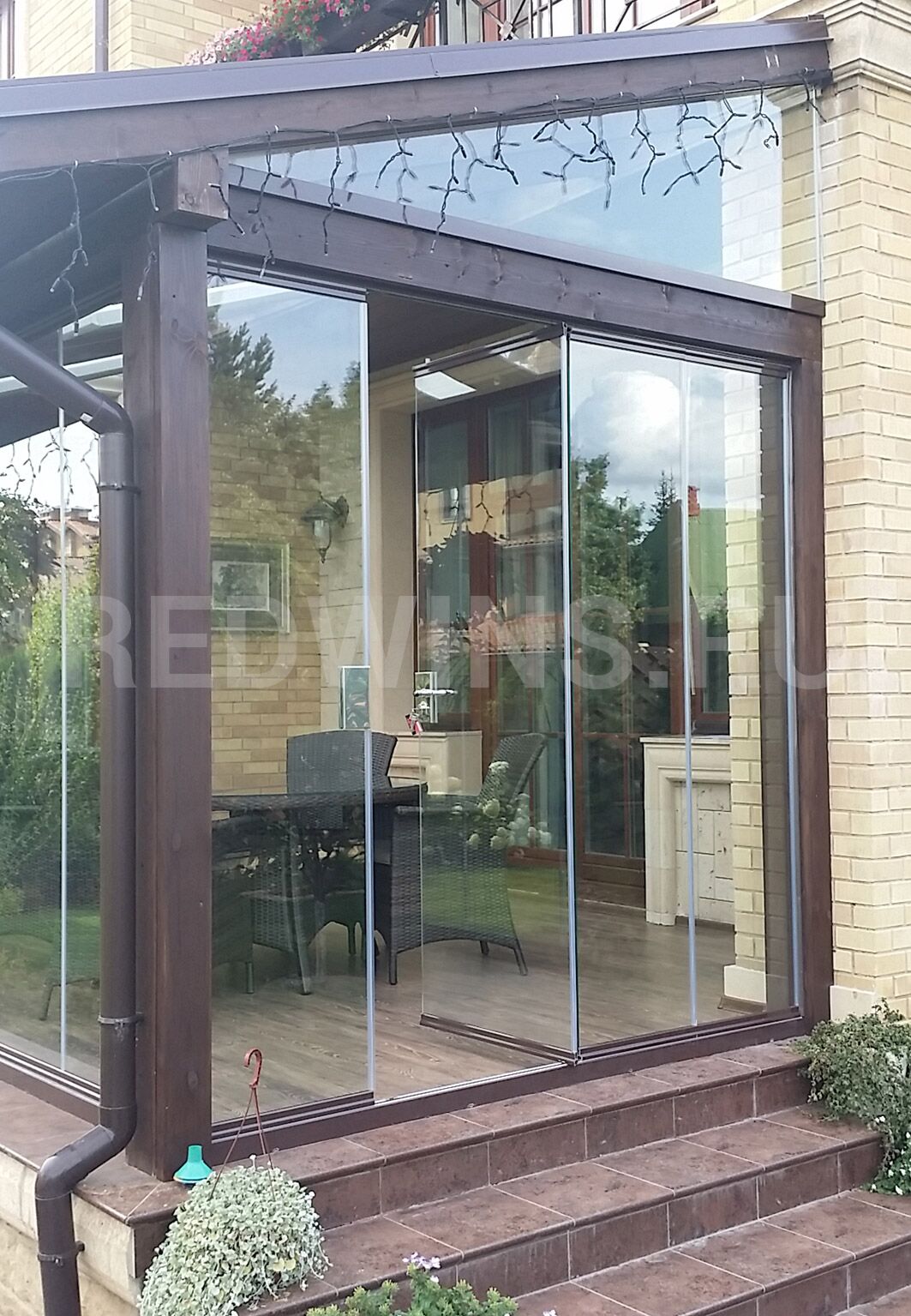 Безрамное остекление террасы. Стеклянная кровля.