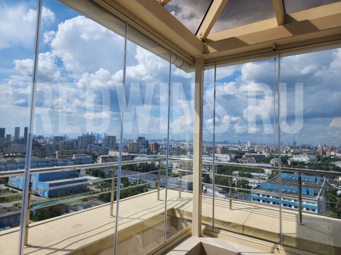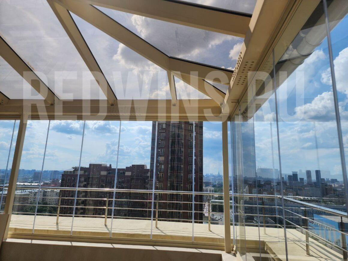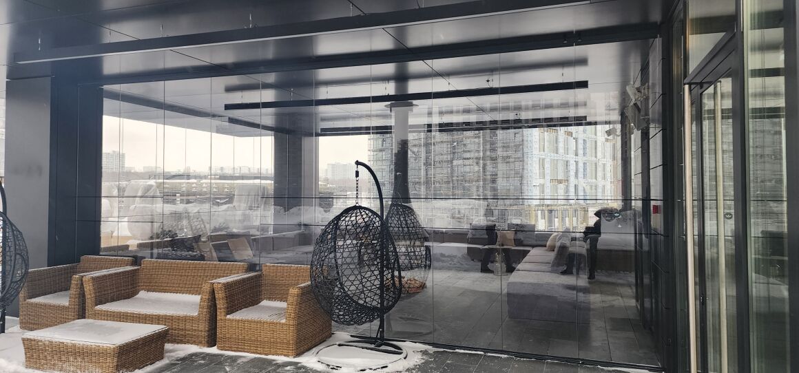 Безрамное остекление выхода на крышу системой Книжка.